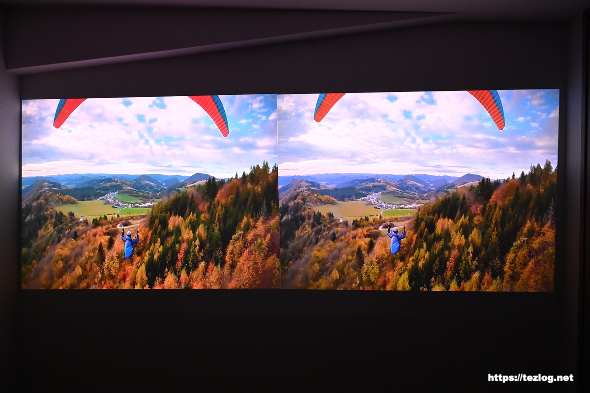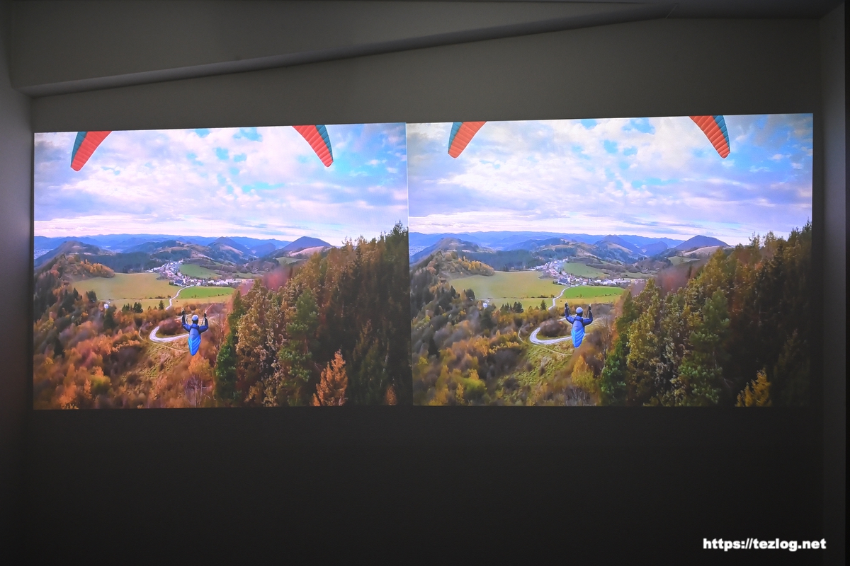 ちなみに、どちらもあくまで壁に映してる映像をカメラで撮影してるので、実際の色味がそのまま写ってるわけではなく、特に赤みが気になりますが、RGBレーザーの特性でそうなりやすいようで、肉眼では不自然さはなく綺麗に見えています。実際の色と合ってるかどうかよりも明るさや色の鮮やかさなどの差を見るポイントにしてもらうと良いと思います。